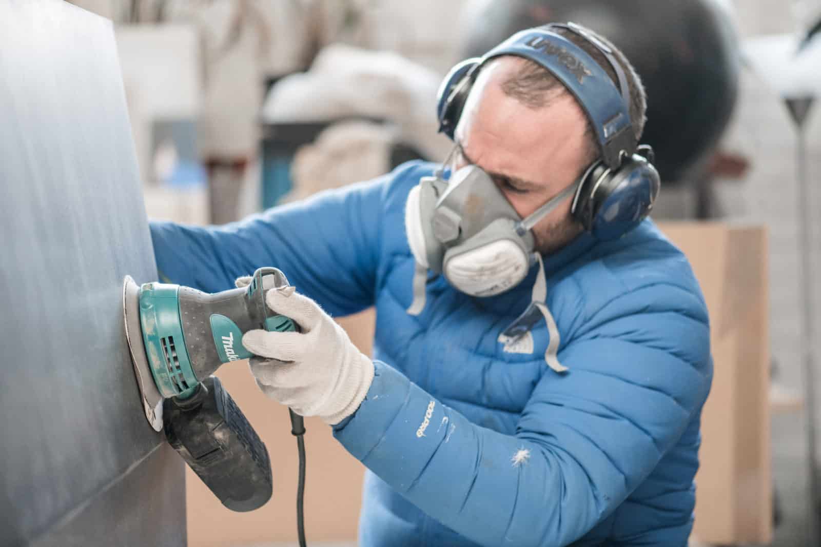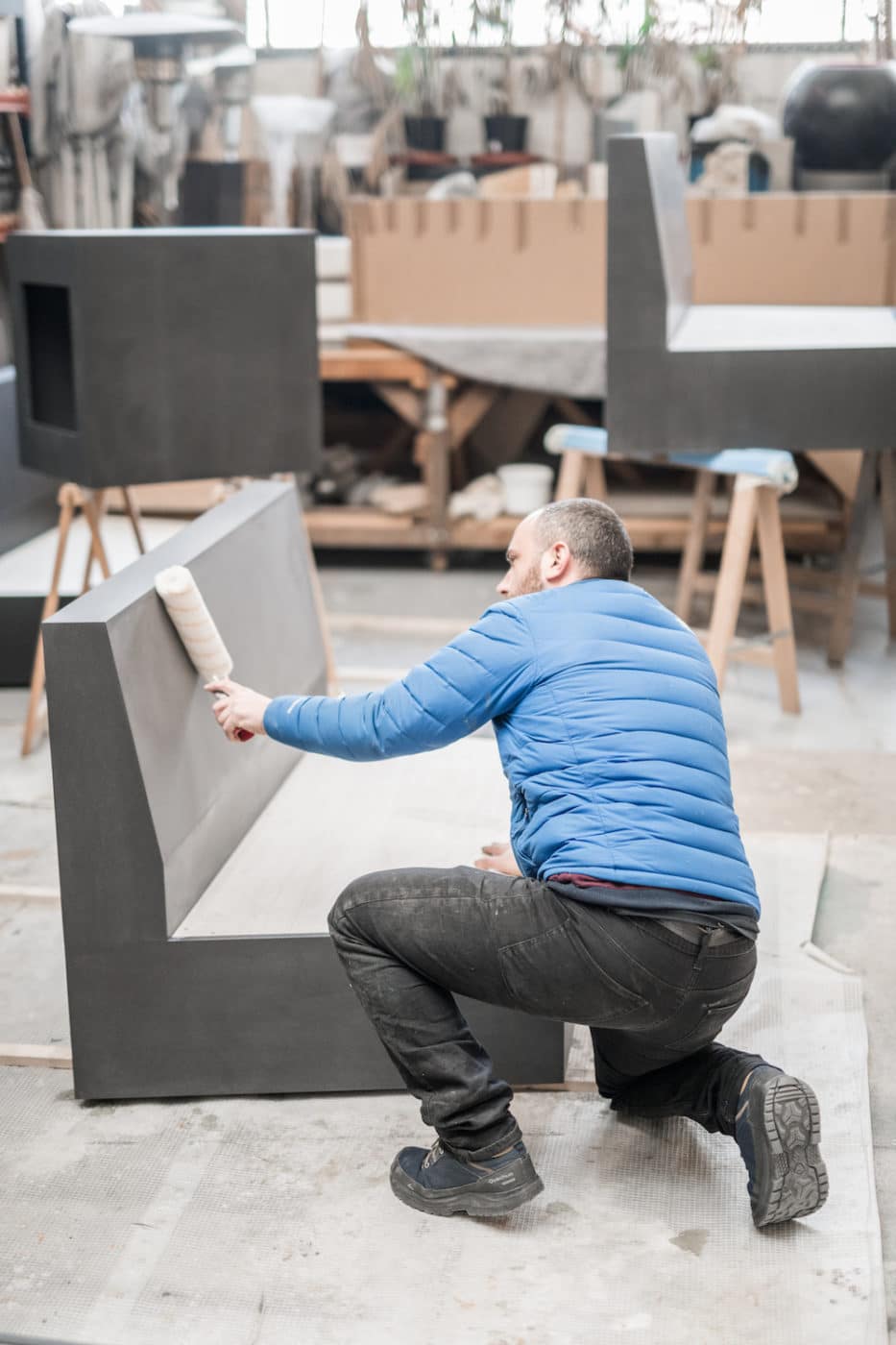 Couches in painted MDF with pleather cushions – designed and built by the Atelier Nils Rousset.