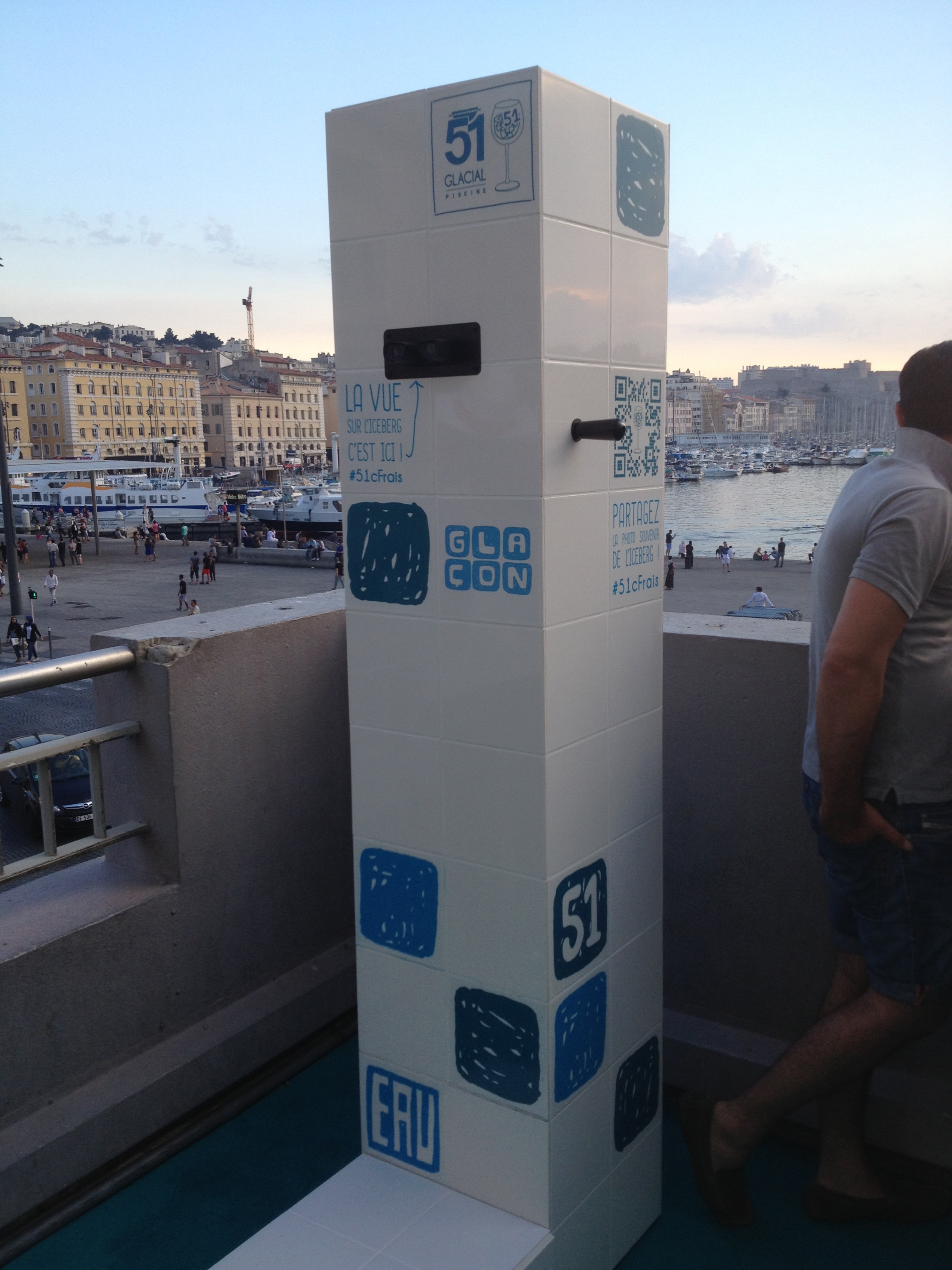 The Atelier Nils Rousset created a tiled podium on the balcony of Club Pernod in Marseille. Integrated in this creation are stereoscopique glasses that give a trompe l’oeil effect of “augmented reality”. Result: a giant iceberg floating in Marseille’s Vieux-Port!