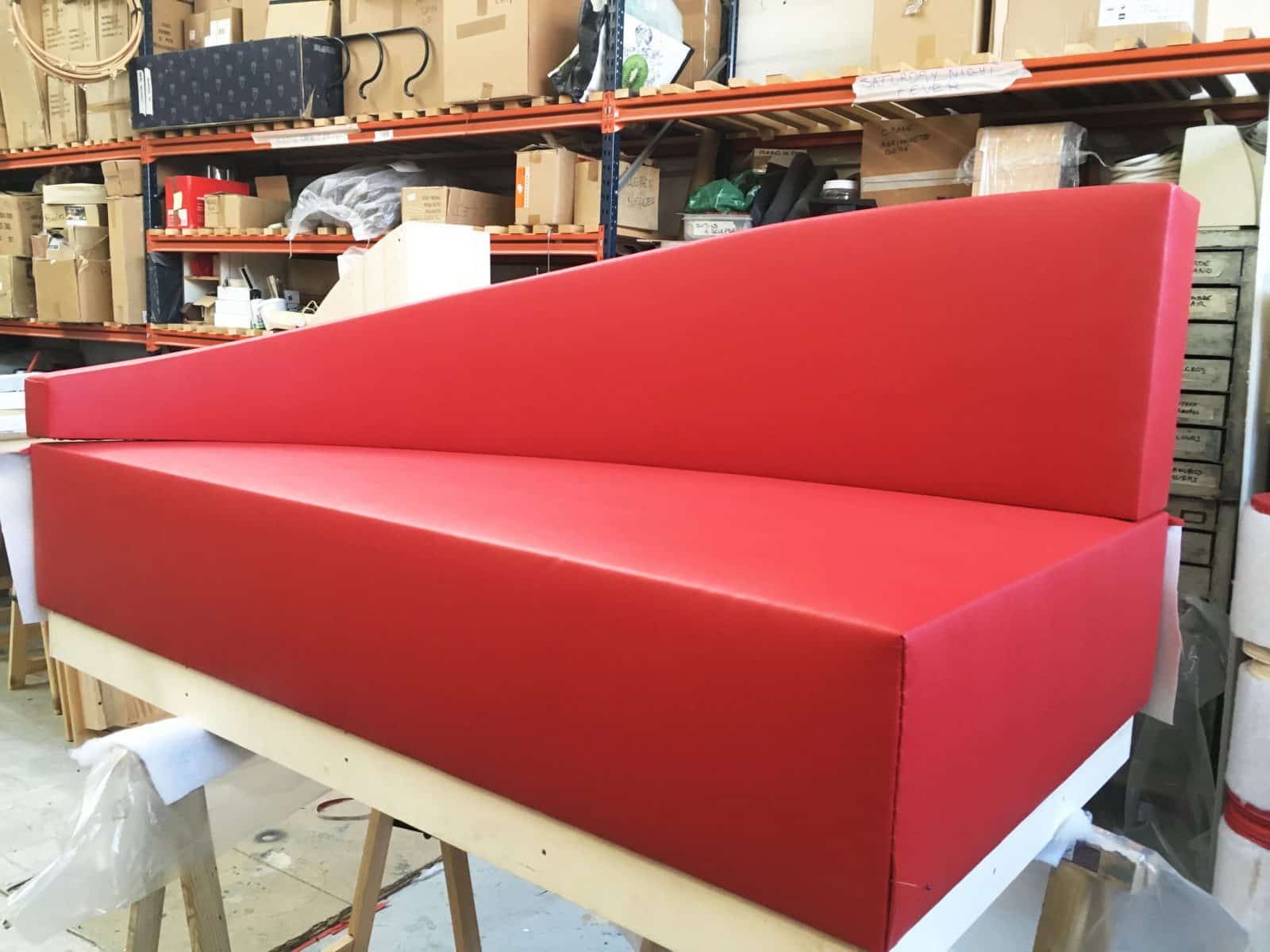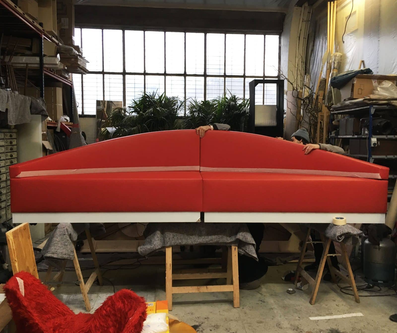 Red pleather sofas and retractable, mirrored strips on wheels