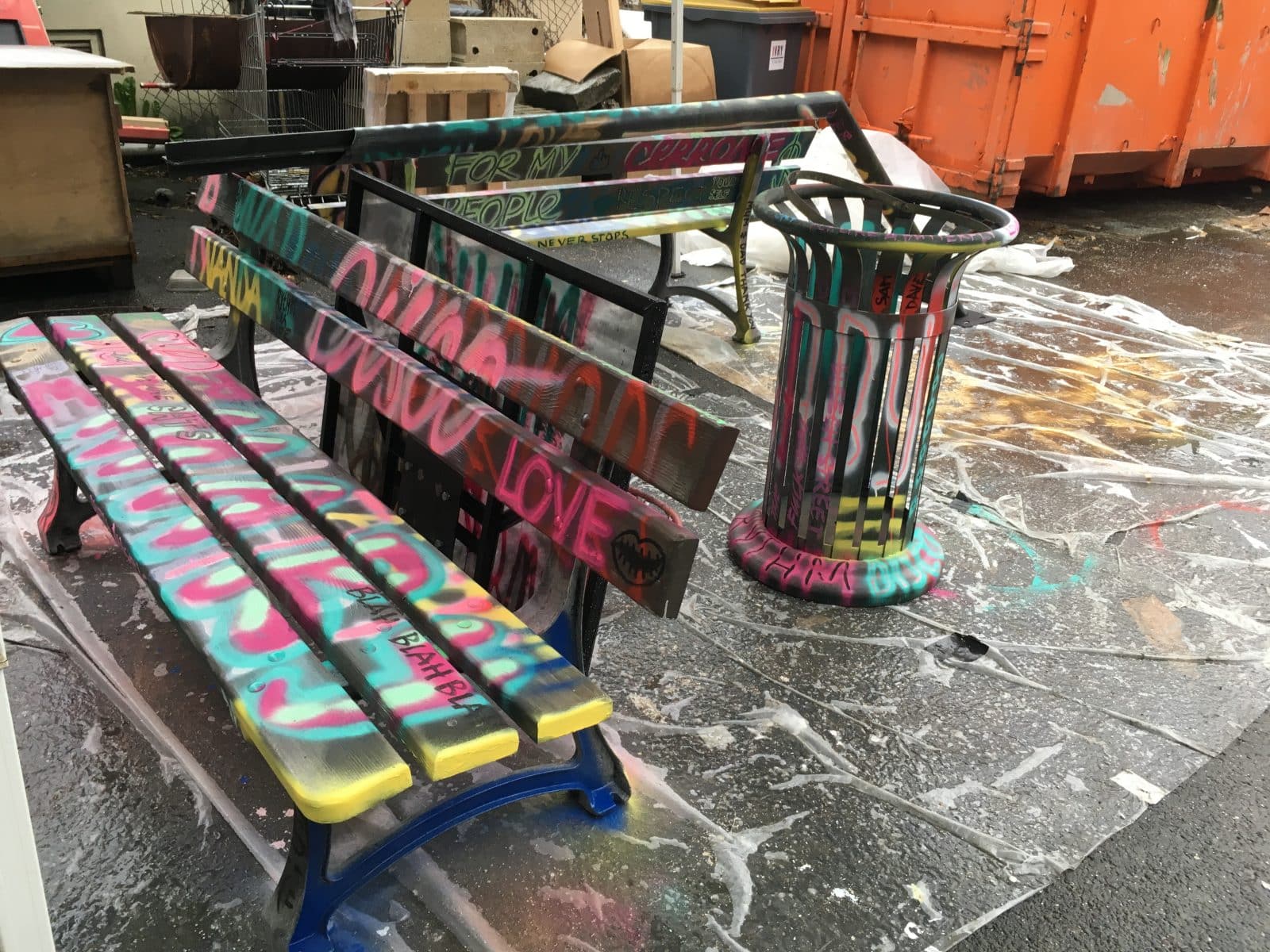 Bronx-style benches and trashcans with graffiti