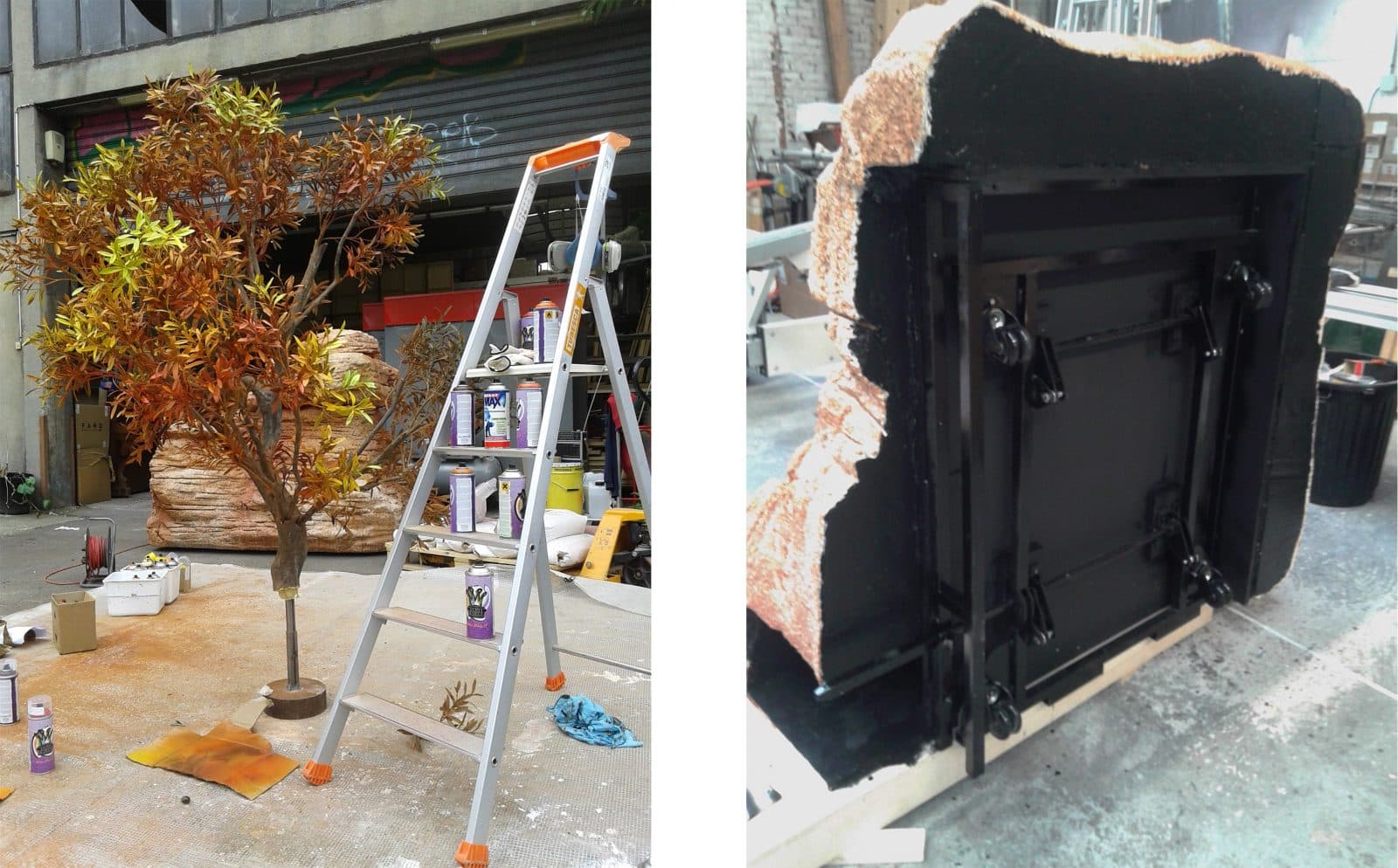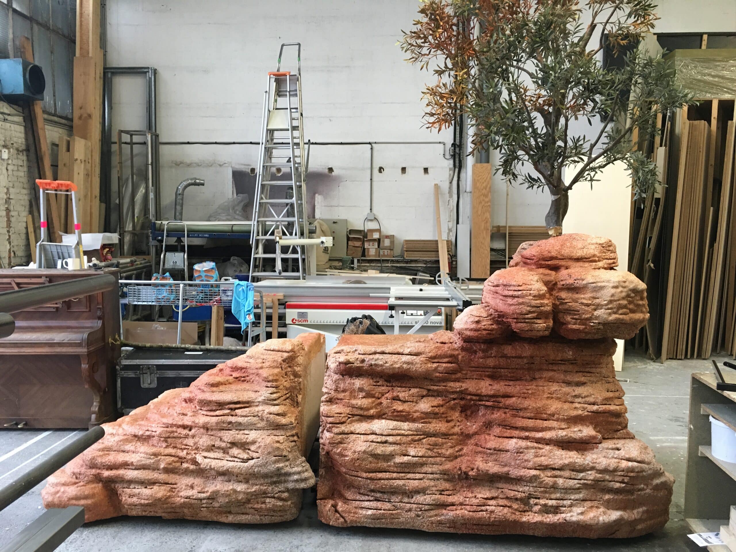 Sculpture d’un rocher “mont sinaï” résiné et peintLe rocher est praticable et séparable en deux parties–Réalisation d’un système de roulettes escamotables pour le rocherSculpture d’une tablette en fausse pierre–